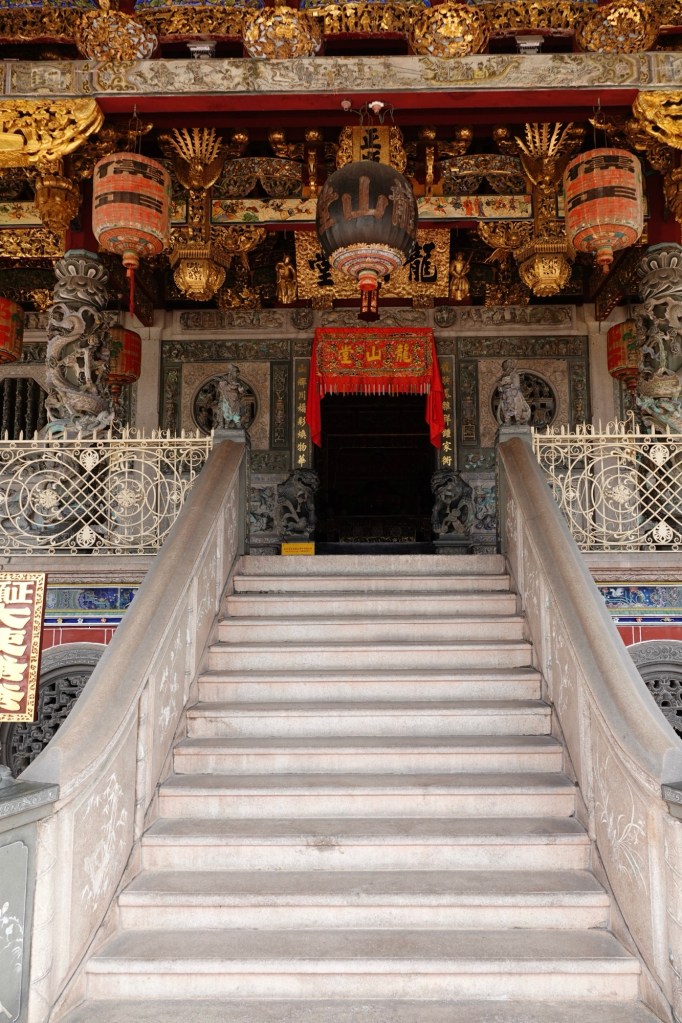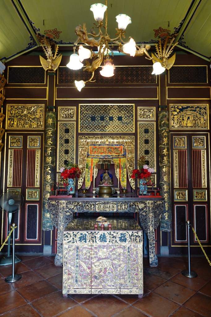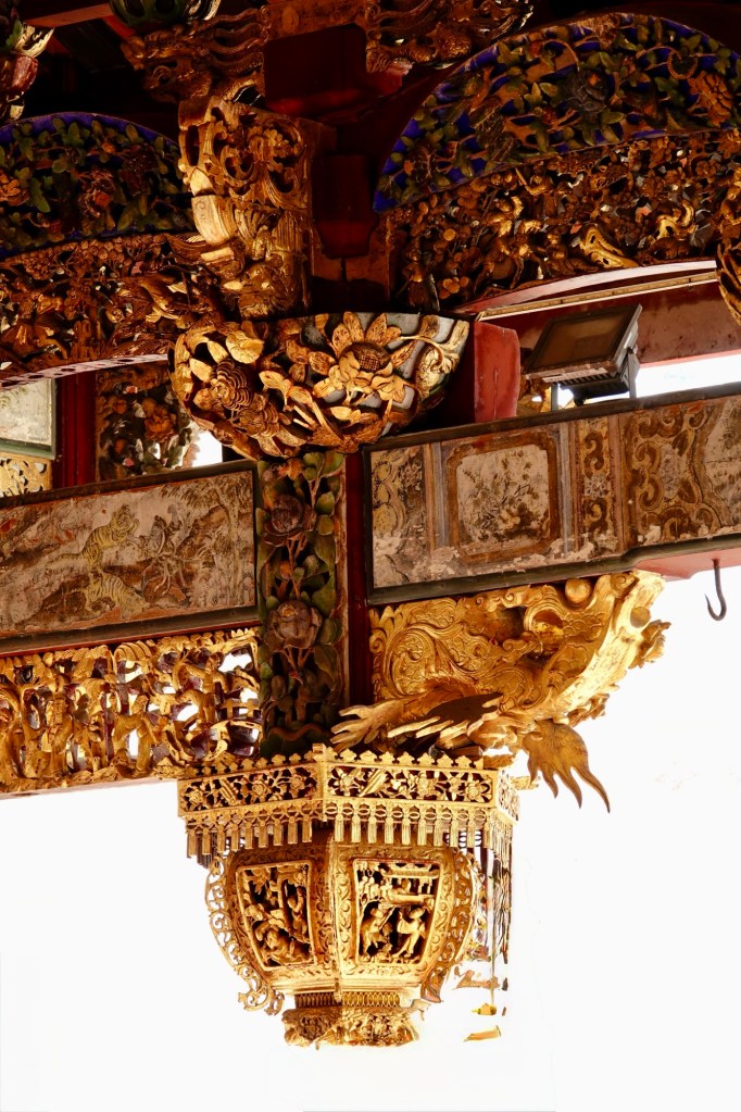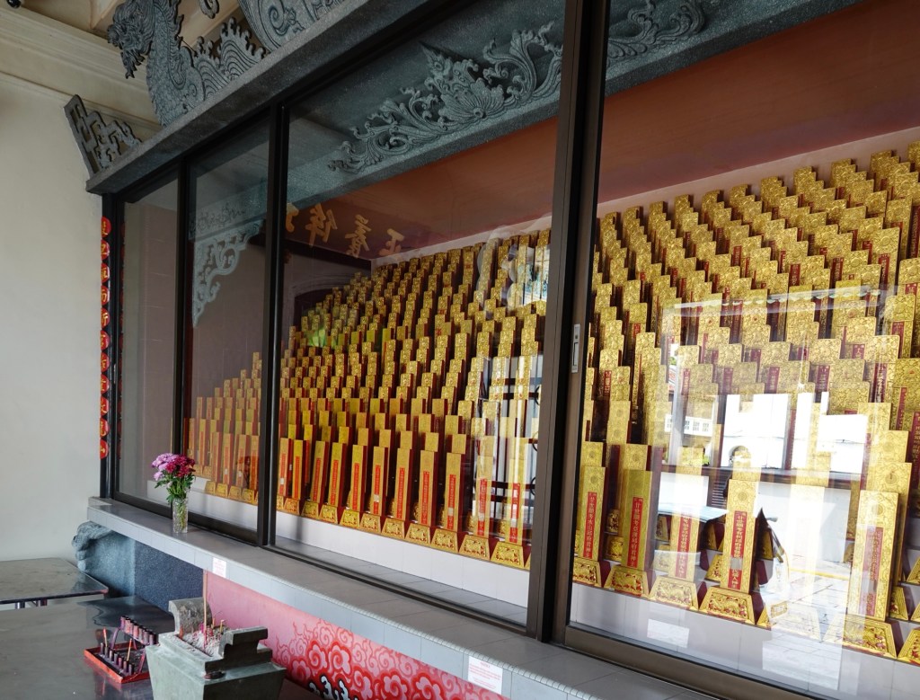 We headed into the Hock Teik Soo, which was a kind of space we’d never seen in a temple before. The altar was familiar enough, but the gold plaques on the walls were definitely not.