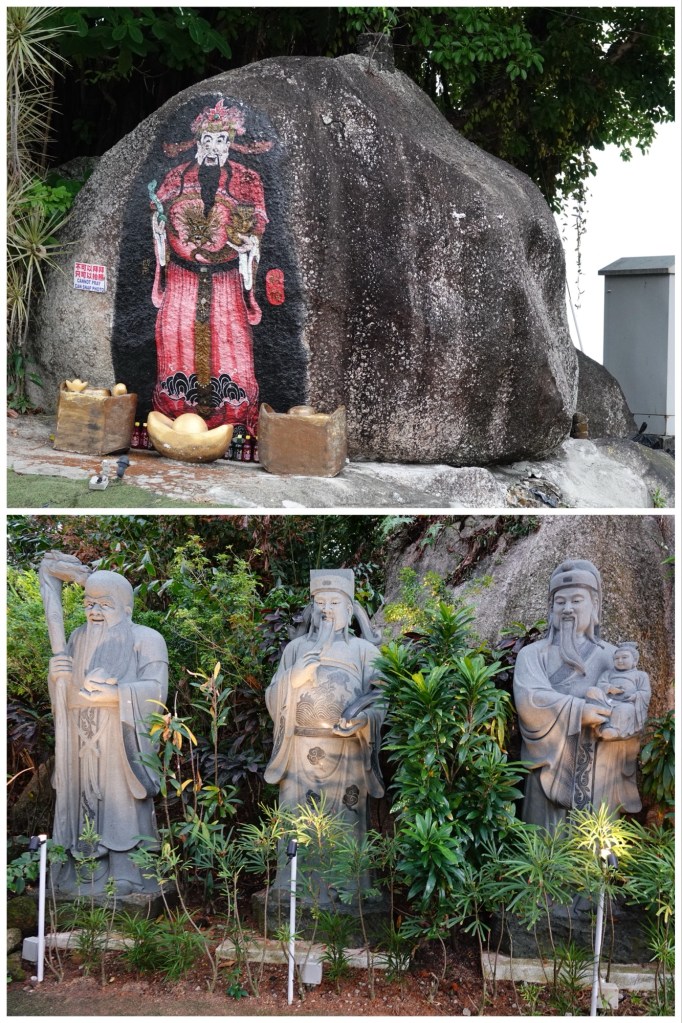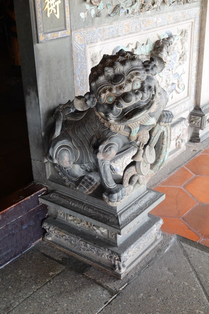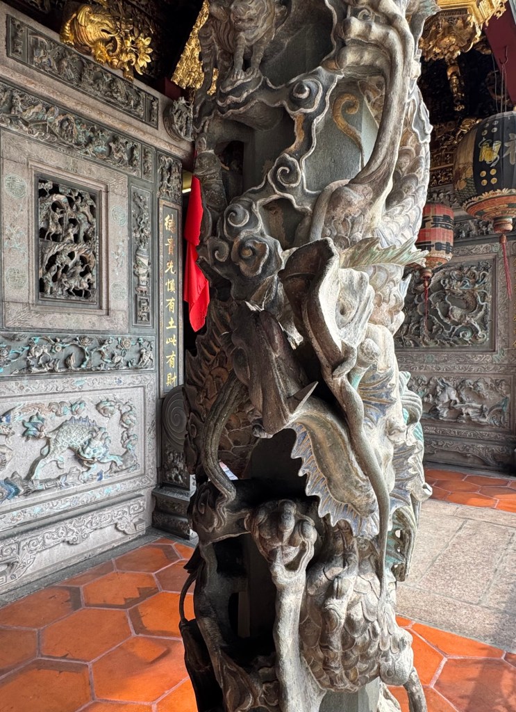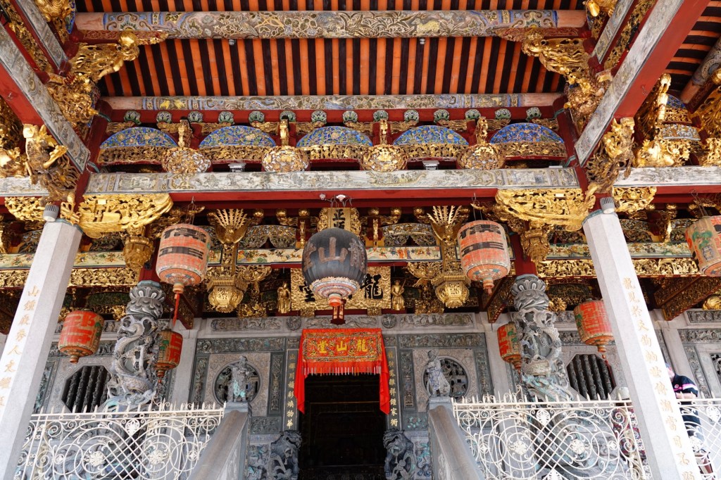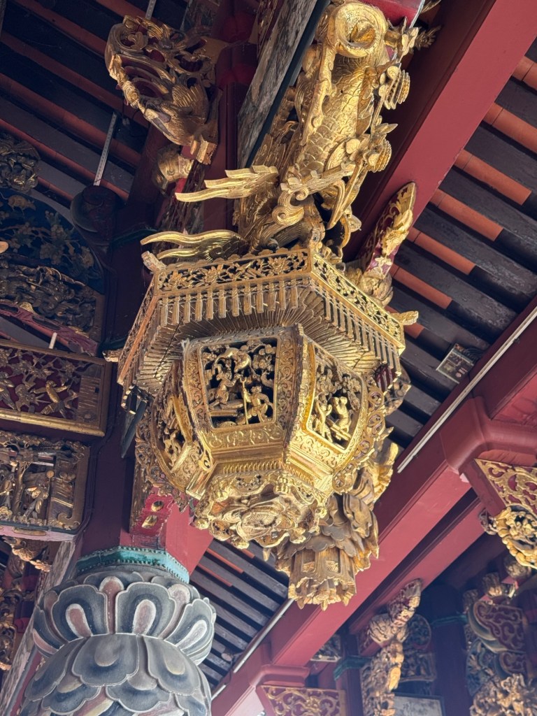 We headed into the Hock Teik Soo, which was a kind of space we’d never seen in a temple before. The altar was familiar enough, but the gold plaques on the walls were definitely not.