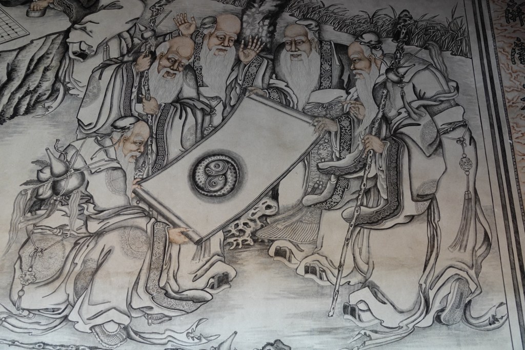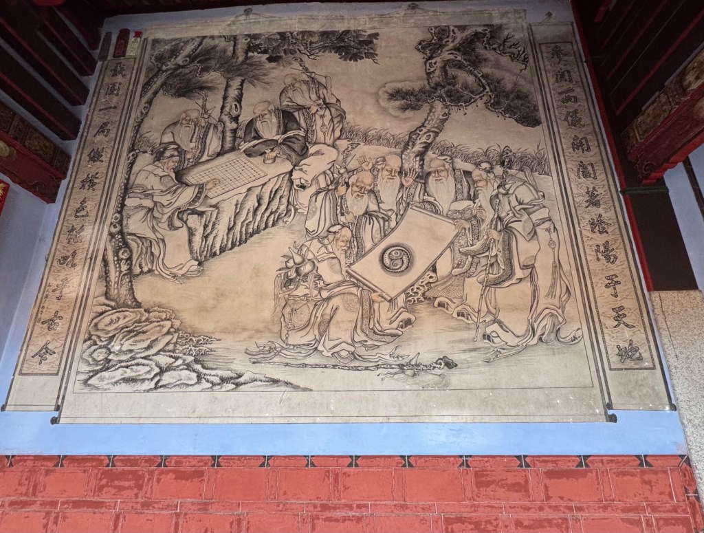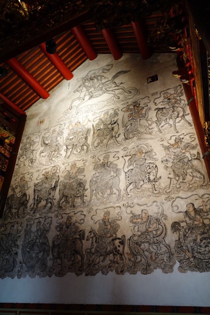 We exited through a rear side door from the central hall into the rear corridor, where huge murals, done in simple Chinese brush painting, contrast starkly to all the glittering gold and ornate sculpture. The murals are almost 100 years old and are considered some of Penang’s most important heritage treasures.