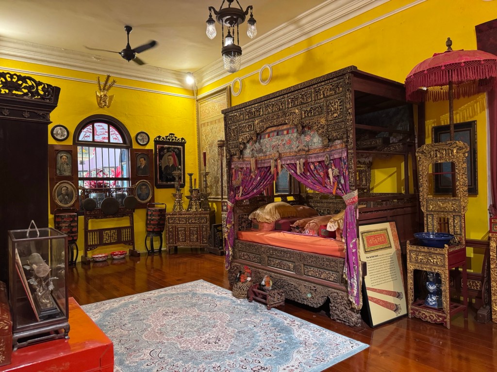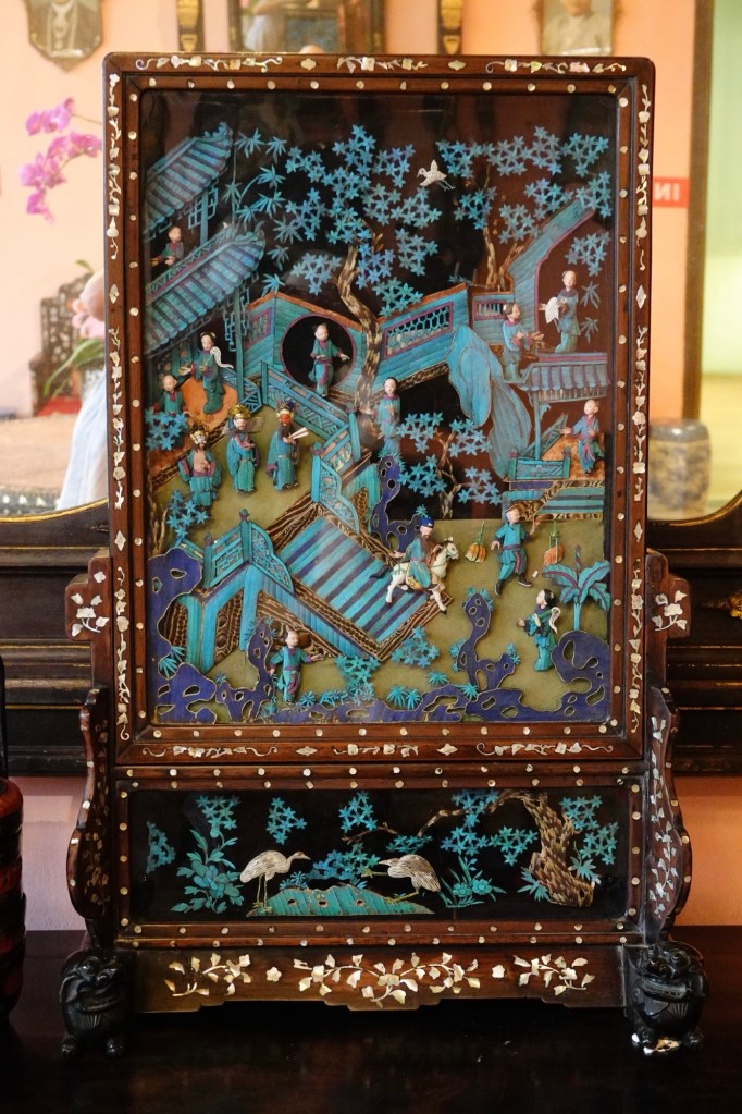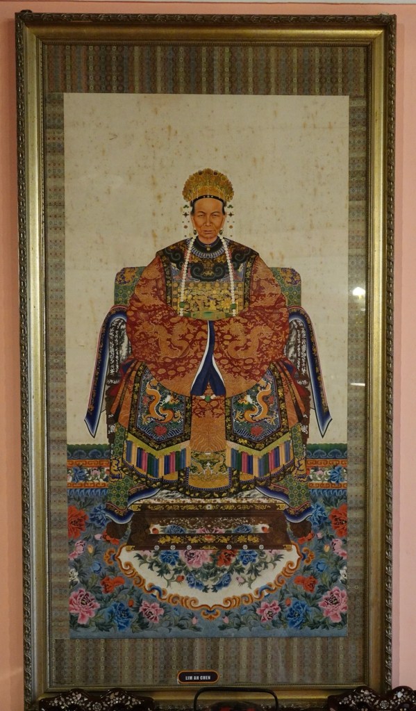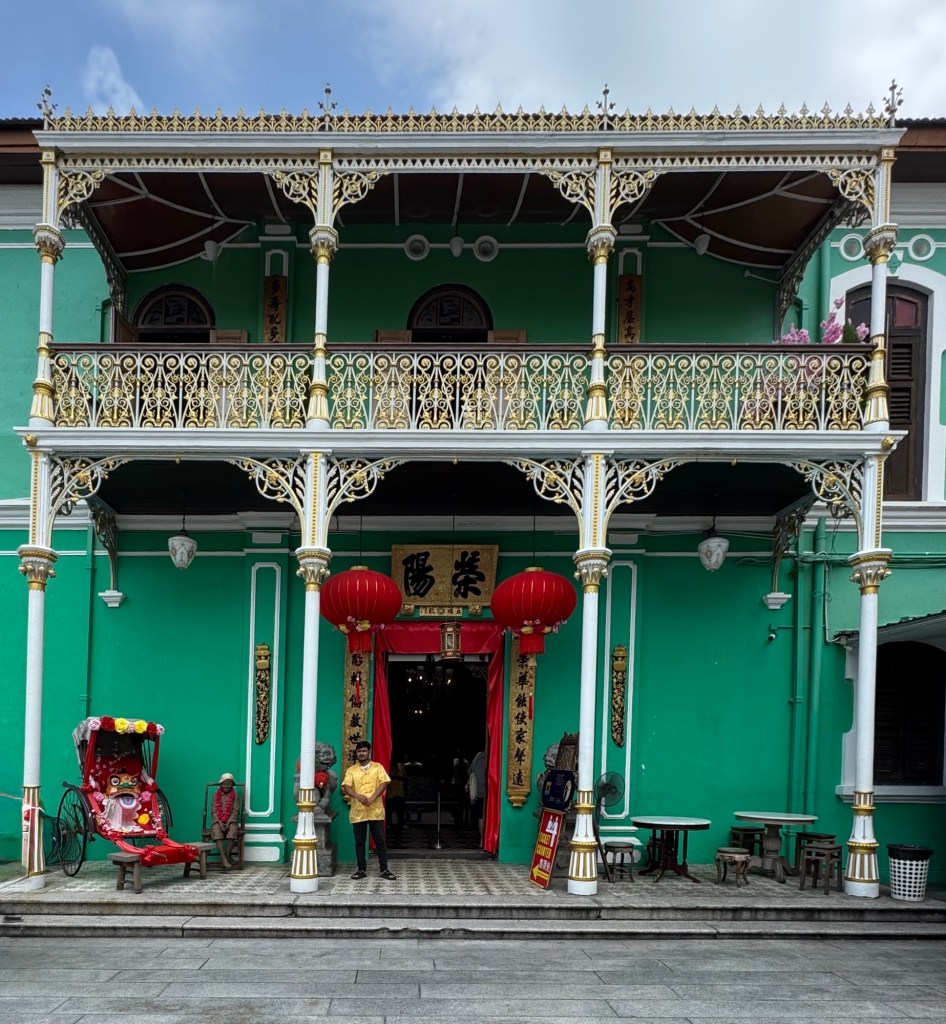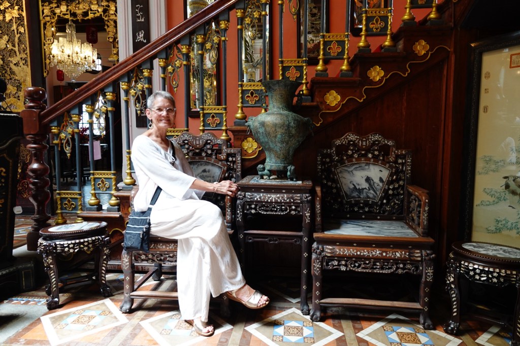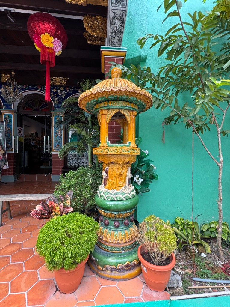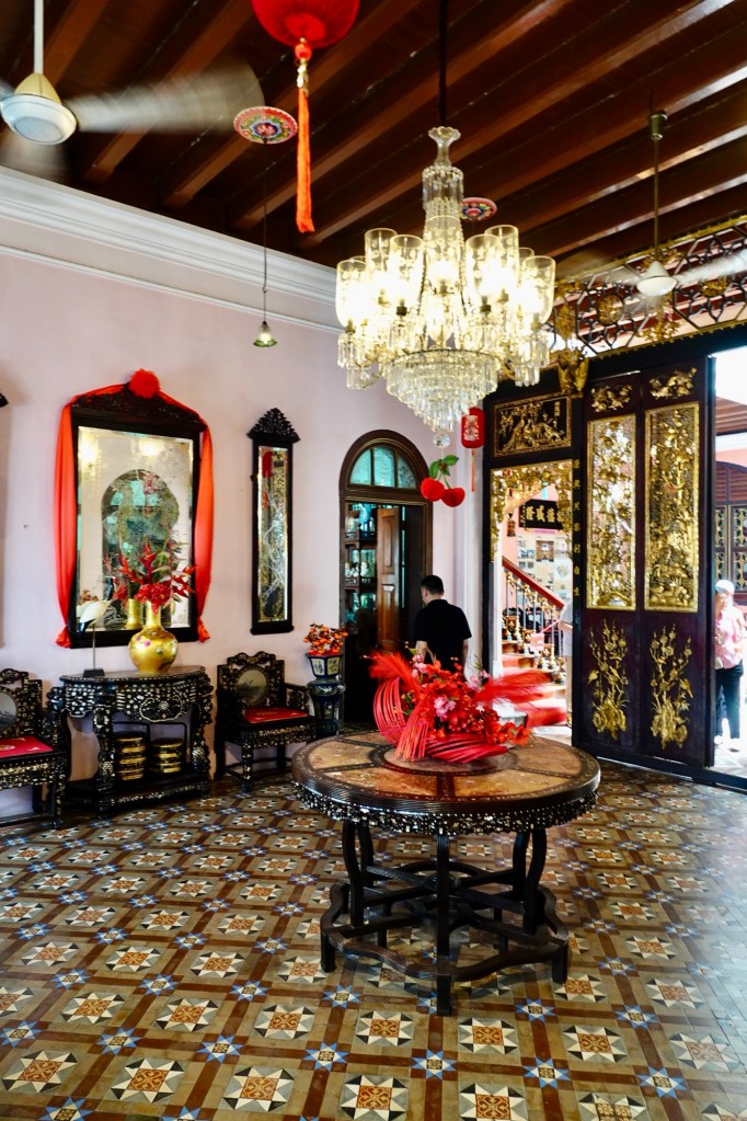 This mansion was built between 1893 and 1895 for 19th-century Chinese tycoon Kapitan Chung Keng Quee, a millionaire philanthropist and tin-mining magnate millionaire appointed “Captain China” by the British in 1877. We’ve seen “Kapitan” on various buildings, including mosques, named after prominent individuals. It has nothing to do with naval or military service, but is simply an honorific. Our guide today described Kapitan Chung Keng Quee as “gangster” capo, based on his role as leader pf the Hai San, a Chinese secret society in British Malaya.