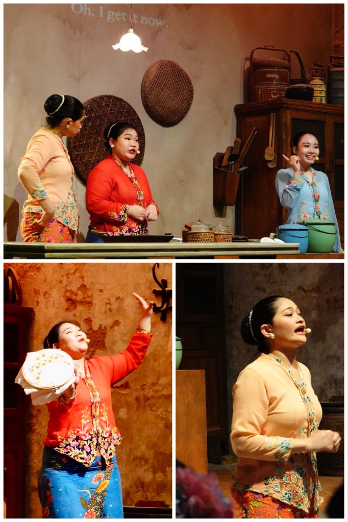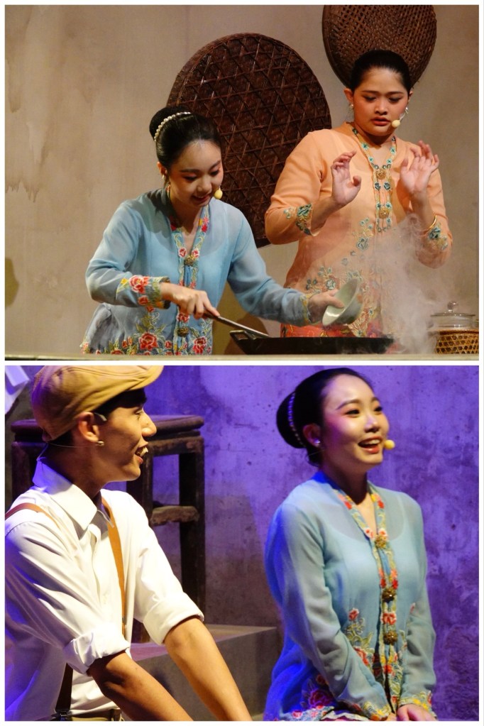 Part of the experience at the mansion is a humorous play, performed in Chinese (although with some surtitles projected on the stage backdrop), on the theme of a a Peranakan wife being able to sew her own sarong, and cook delicious food. Two older sisters try to “rescue” the cooking skills of their newly wed younger sibling, whose husband is lovestruck but cannot stomach her cooking.