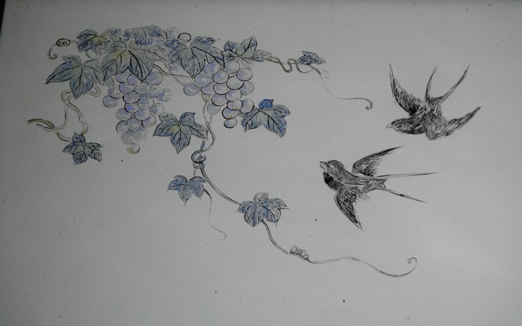 The upper level is open to the first floor, and both are open to the elements from above. That design allowed both air circulation and collection of rainwater into a square pool on the ground floor. Surrounding the open area are panes of frosted glass painted with birds and flowers in delicate pastel colours.