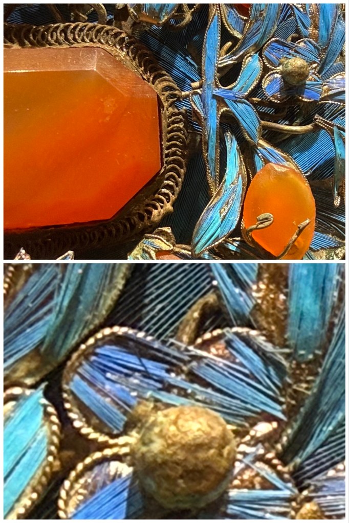 This jewellery set is made of individual Kingfisher feathers set with carnelians in gilt silver. It is estimated that it would have taken up to two years to craft, using only one or two feathers from any bird caught. The birds were never “plucked” or killed since, as Stanley put it, “you don’t kill the goose that lays the golden eggs”. The technique of separating each feather into its individual barbs, and then interweaving them has been lost. Plus, Kingfishers are a protected species.