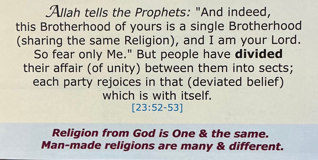 Lest we think otherwise, it was emphasized to us that there is no difference between Allah, Jehovah, or God except for the language of the words. The concept is “One God, one humanity, one religion, many prophets.”