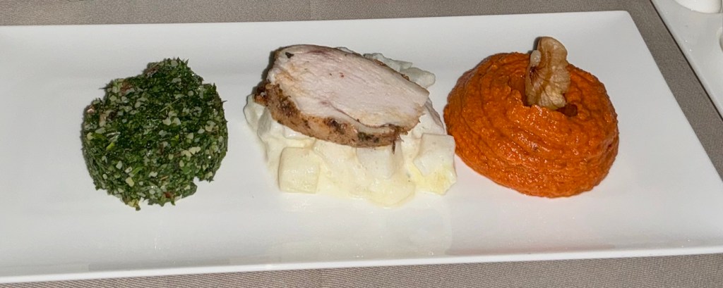 He came to greet each of us by name and take our meal orders.Since we’d eaten in the lounge (not expecting that a midnight flight would have a full dinner after takeoff), Ted and I both just ordered appetizers and desserts. As my aperitif I had the minted lemonade.
