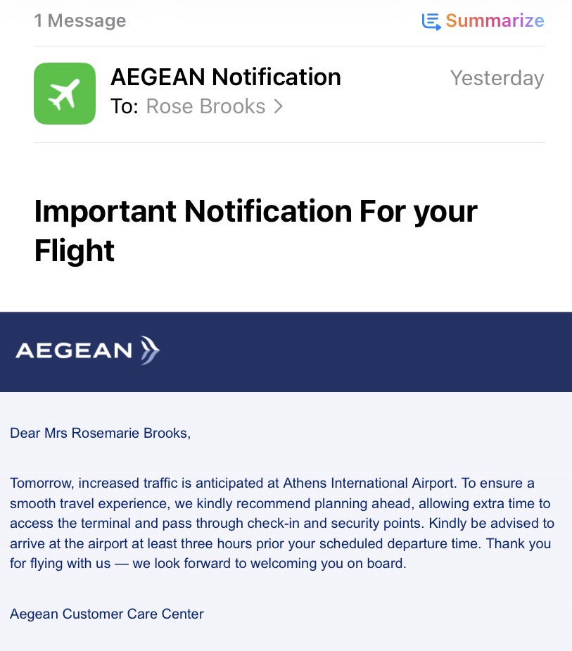 Because we were in the second row, we got off the plane quickly and into what was already a scarily long line. When we finally reached the Greek customs and immigration officer, he took our passports, scanned our faces, but then waved us away from the fingerprinting screen that everyone else had been asked to use with “it’s fine, you’re perfect”. It’s certainly nice to be perfect (LOL), but we’re confused.