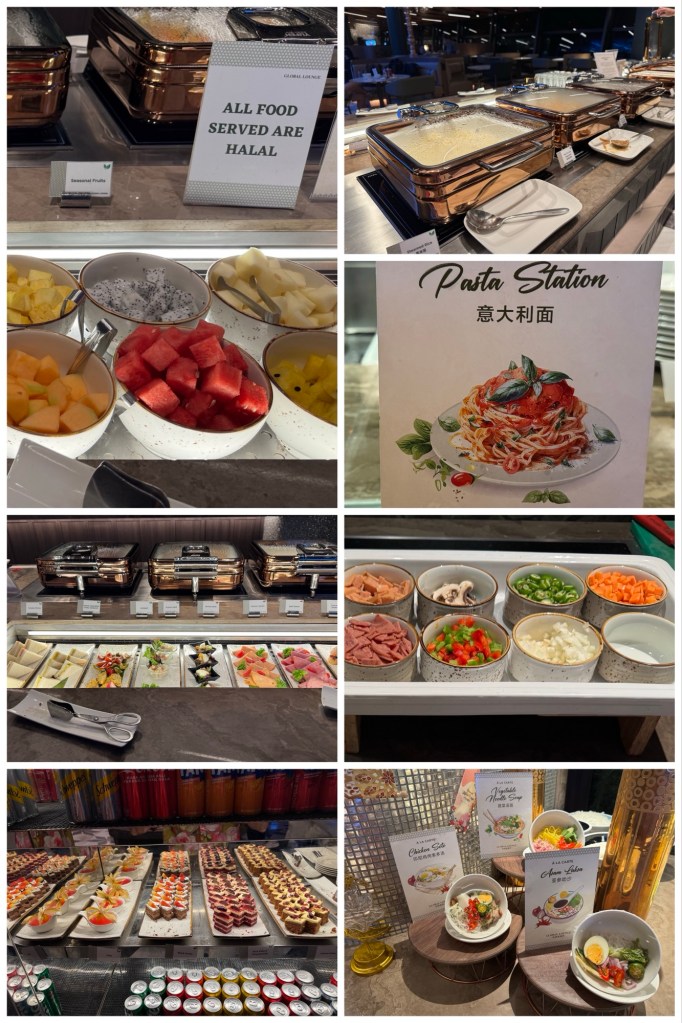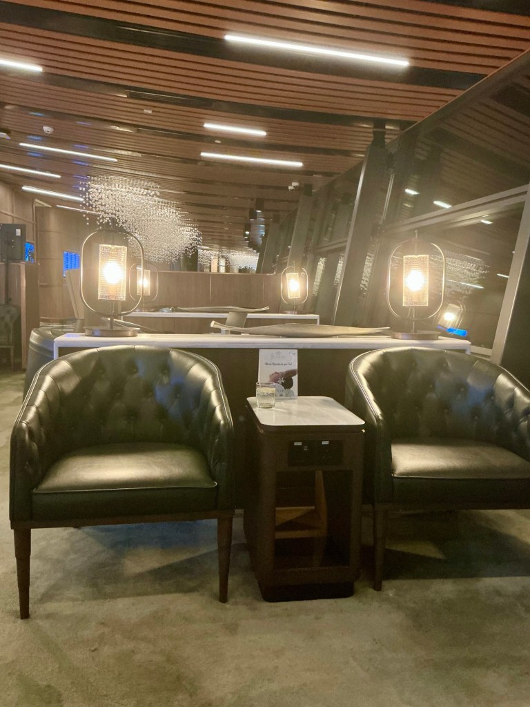 Finally, at just before 8 p.m., the check-in counter opened, happily confirmed that our luggage would not have to be picked up in Athens, and we headed to the blissfully quiet Global Lounge, where there were plenty of charging stations and lots of dividers creating semi-private spaces.