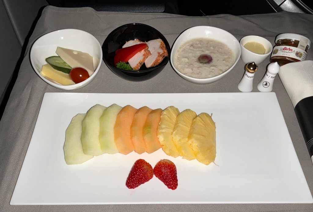 The timing of the flight offered another chance at breakfast, after a welcoming drink. I was intrigued by the offer of cherry juice, but opted for sparkling water, while Ted had coffee.
