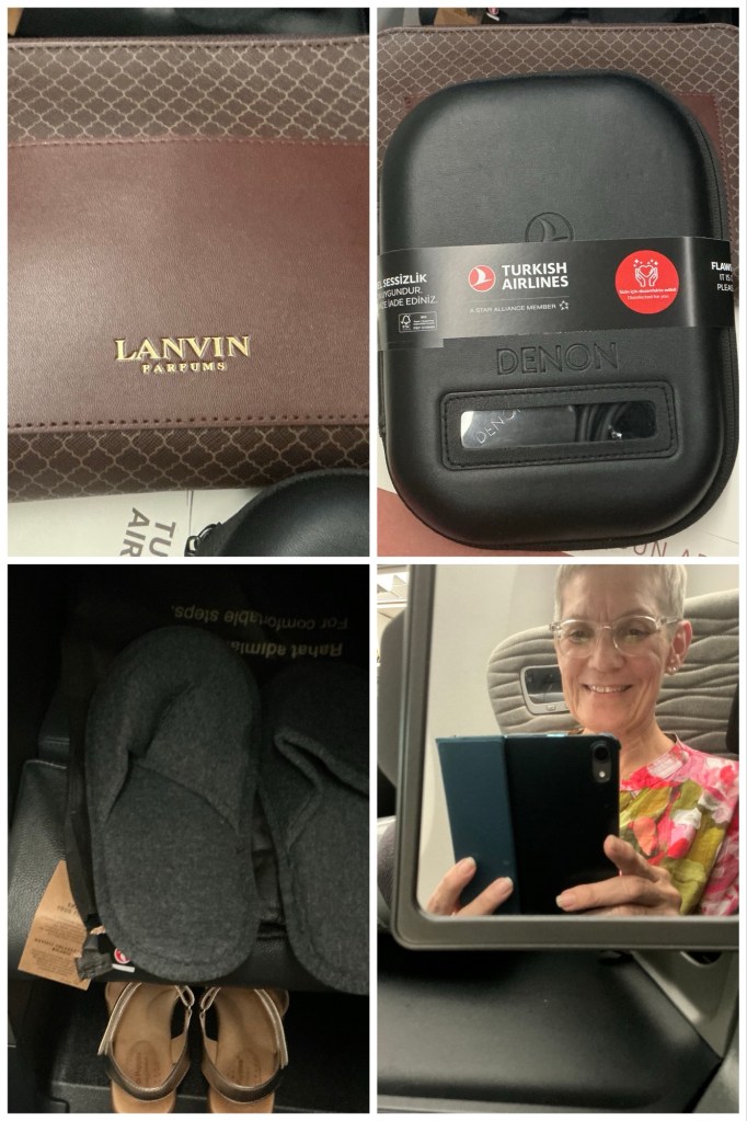 I slept quite soundly for 6 hours, waking when my internal clock (on Malaysian time) said it was 7:30 a.m. Unfortunately, that was only 2:30 a.m. Istanbul time. Ted was already awake. Nonetheless, that meant only 3 hours to go in our flight, made more pleasant by being able to brush teeth in a lovely bathroom redolent of a light fresh Lanvin fragrance and with lots of light and mirrors (regular, makeup magnifier, and full length), followed by coffee in a real cup accompanied by a cube of dark chocolate with almonds.