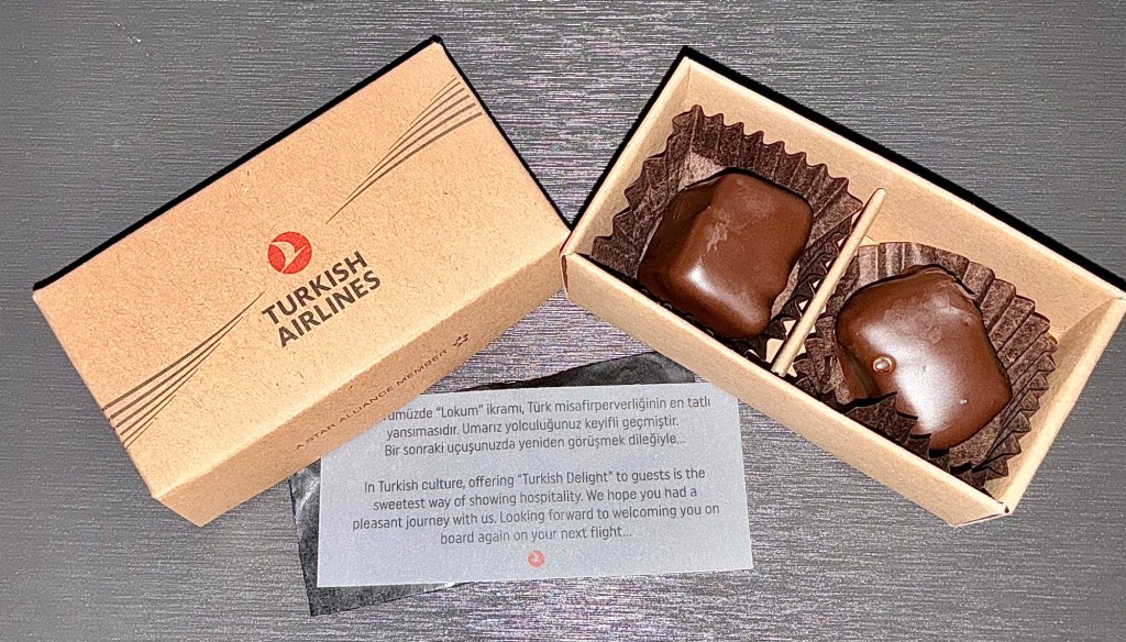 When the Captain announced that we were landing, it was hard to believe we’d just spent almost 11 hours in the air. The service throughout the flight was exemplary, and our parting treat was a small box of chocolate-covered Turkish Delight, just about my favourite sweet.