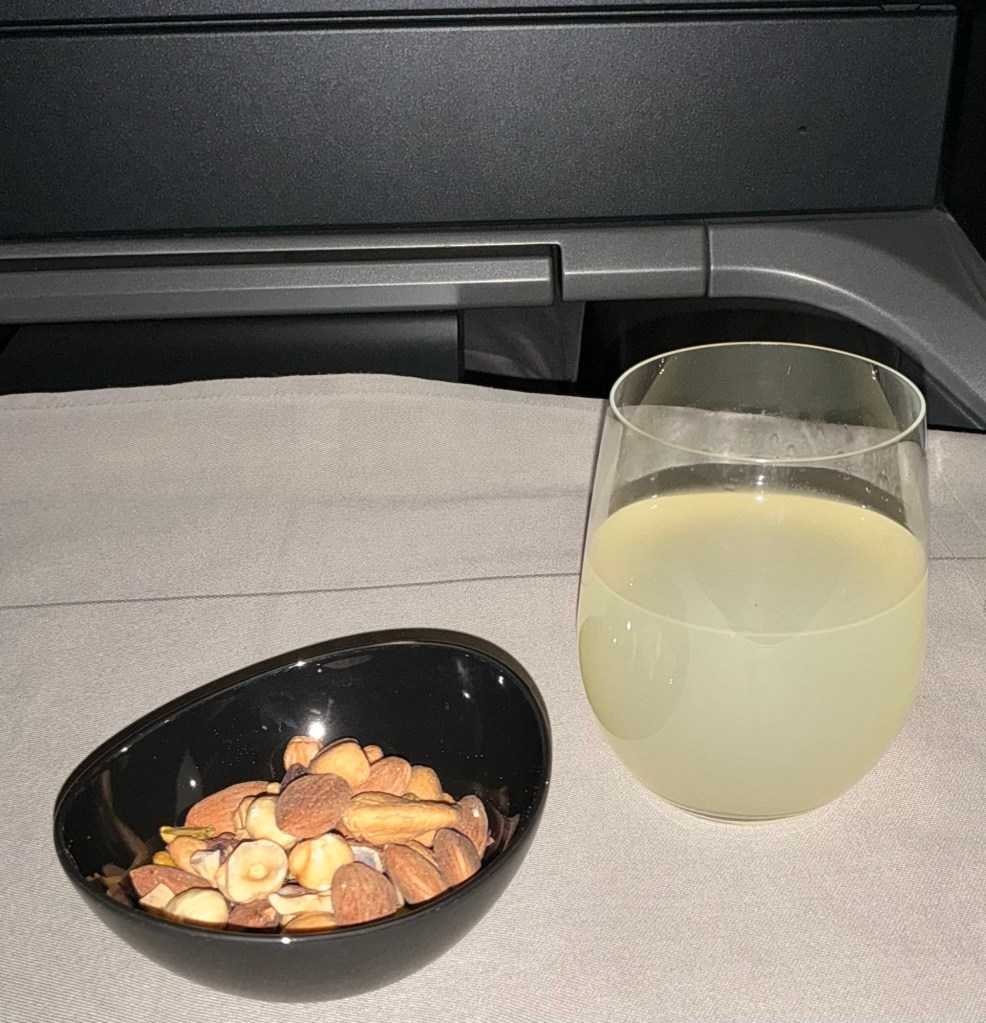 Our pre dinner drinks arrived shortly after we were in the air, and came with warm mixed nuts.