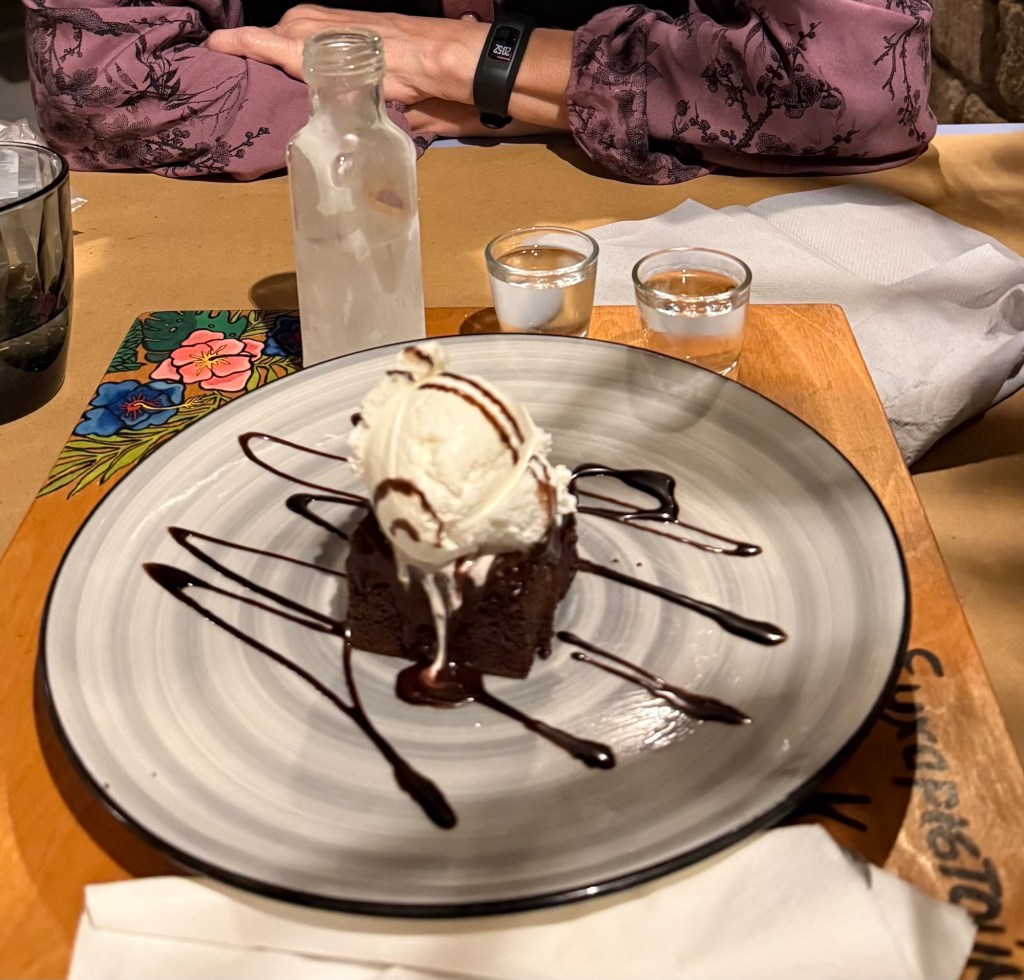 Just as we were thinking about leaving, a surprise dessert arrived: chocolate cake with a scoop of creamy vanilla gelato, and a freezing cold bottle of rakia containing enough for 5 shots!