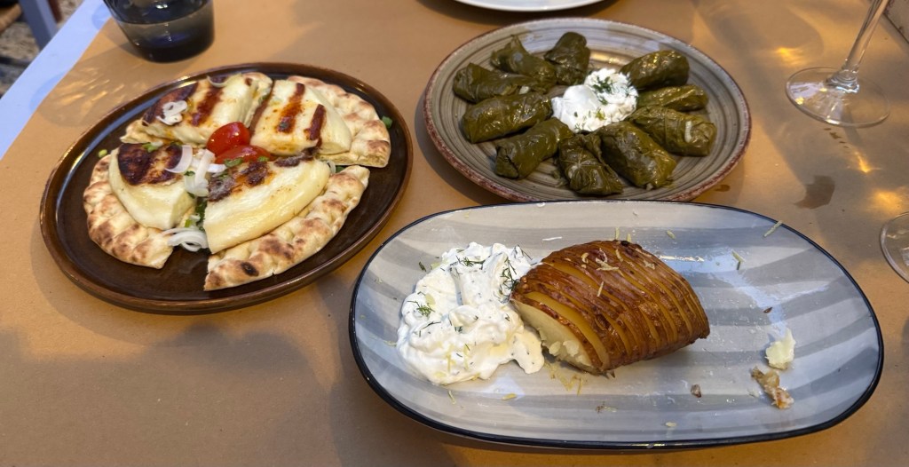 Next came our appetizers: a thinly sliced hasselback potato with dilled Greek yogurt, a plate of dolmadakia (small dolmades), and grilled talagani cheese with warm honey served on fresh pita.