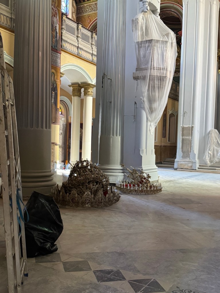 We were not allowed beyond the threshold of the door to the nave, and nowhere near the sanctuary where the altar was shrouded in multiple layers of tarpaulins.