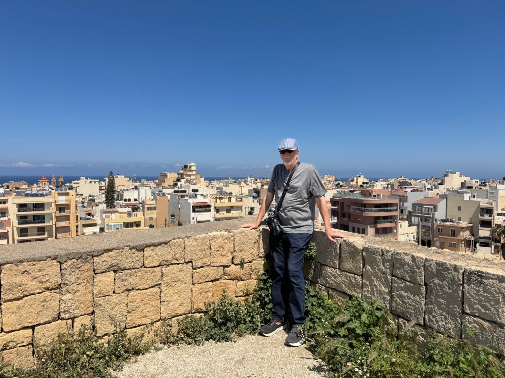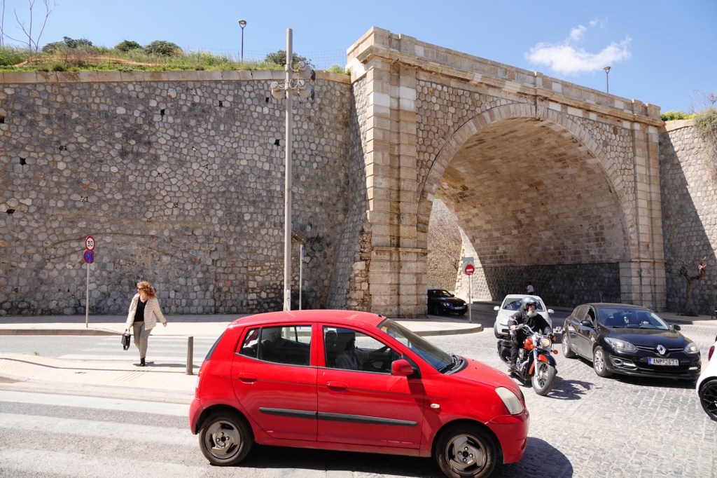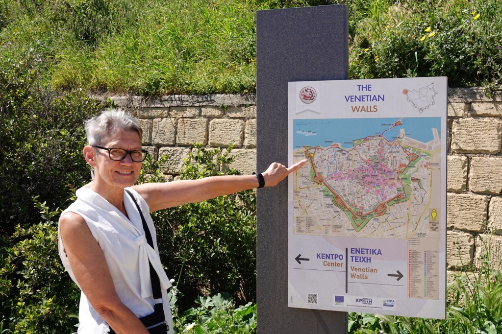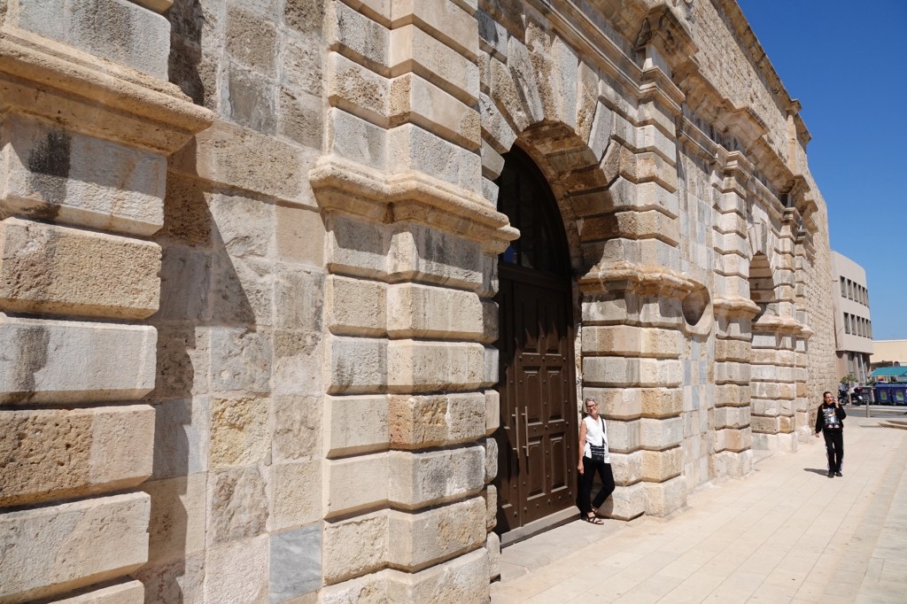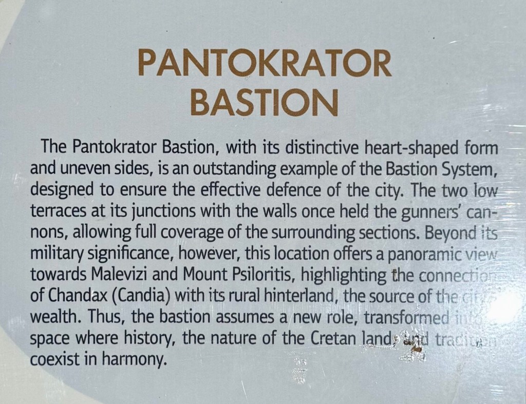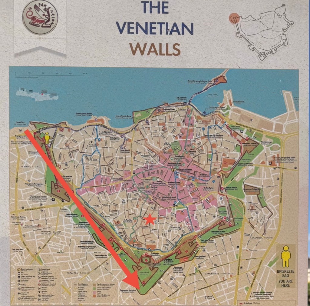 We descended the stairs back to street level, where we had hoped to enter the wall via the Martinengo Gate (Makasi Gallery) but it is being reinforced and restored as part of the same multi-year project as the restoration of Saint Minas Cathedral. An interpretive sign explained that “The Makasi Gallery is associated with one of the darkest moments in both local and world history, as in 1943 prisoners captured by the Germans from across Crete were temporarily held here before being transferred to concentration camps. On November 4 of the same year, a number of them were sent to Mauthausen in Austria. On 8 June 1944, hundreds more individuals boarded the steamship Ta-nais, bound for Athens and from there once again to the concentration camps. The vessel was torpedoed and sunk, with the tragic outcome of the loss of almost the entire Jewish community of the island, along with many members of the Resistance. Today, it stands as a Place of Remembrance for the city.”