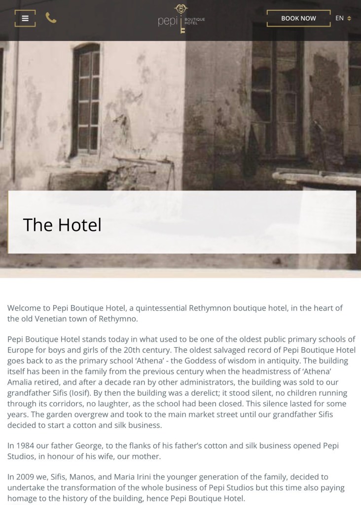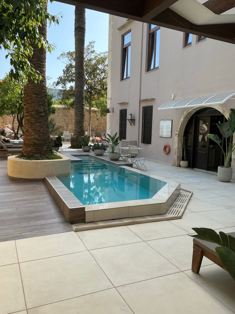 Pepi Boutique Hotel is adults only and has just 17 rooms: 13 standard rooms, 2 Maisonettes and 2 Suites, all surrounding a beautiful garden and a small outdoor swimming pool. That makes it a bit larger than either Campbell House or Kipos Suites, which only had 12 rooms each, but still very personal. Like Campbell House, it has a restaurant – although not a Michelin selected one.