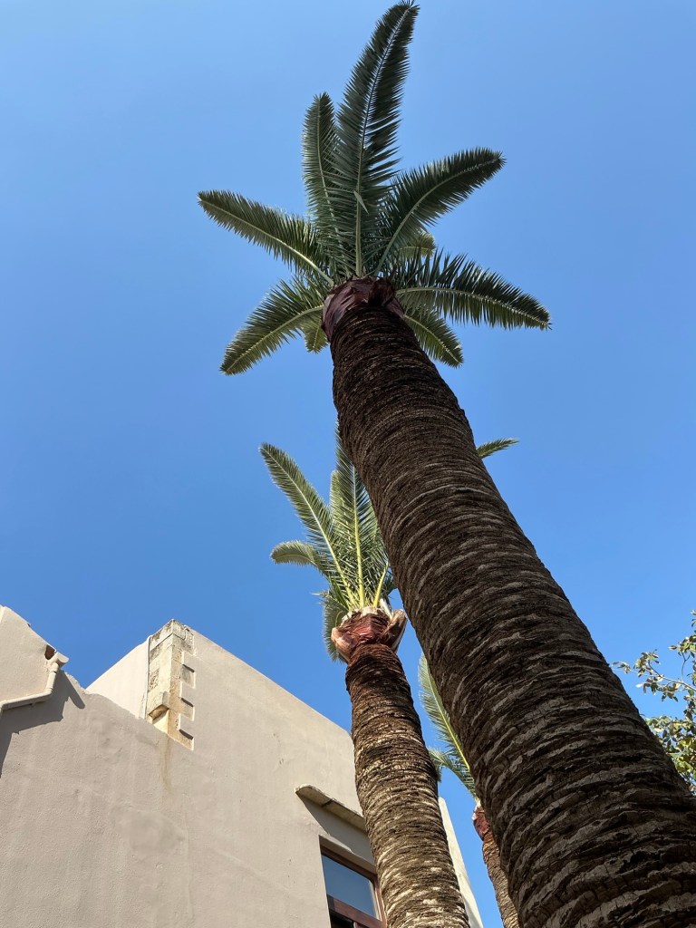 Our room overlooks the patio, huge perfectly trimmed palm trees, and clay-tiled rooftops.