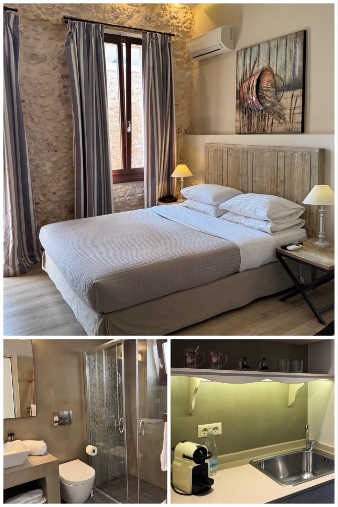 We don’t, however, have even the most minimal cooking facilities, which means we’ll try to have a good breakfast, find a bakery (not hard to do on Crete) for lunch, and go out for dinner each evening.