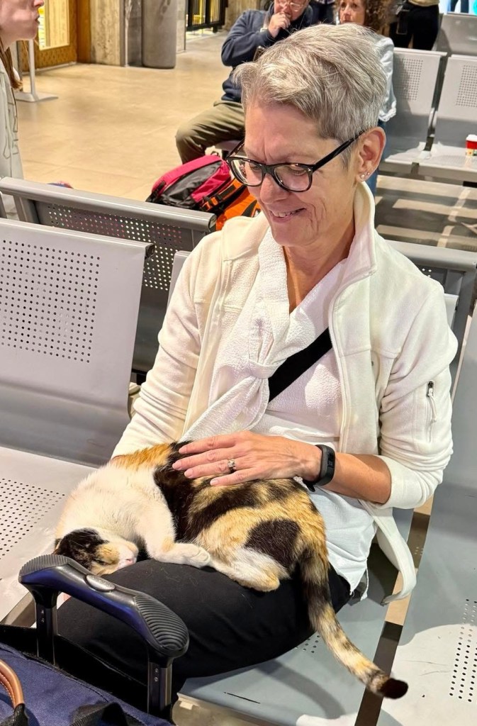 In addition to comfortable coaches, the bonus of travelling by bus was the bus station cat, who immediately made herself comfortable on my lap and went to sleep. Black pants=cat magnet. It’s been a while since I’ve had a lap cat, so I thoroughly enjoyed it for more than an hour. Cats really know how to sleep. She was fickle, though. The moment I needed to get up to use the ladies’ room and grab a sausage pastry from the café she took Ted’s lap.