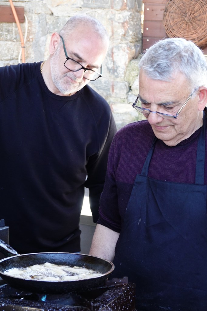 Before leaving the restaurant, the owner George made some fresh cheese (just whole sheep’s milk, boiled, curdled with vinegar) and a simple flour/water/olive oil/raki (for flakiness) dough, and fried stuffed cheese pockets for us. Drizzled with his own thyme honey and sprinkled with sesame seeds they were heavenly.