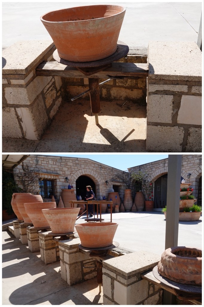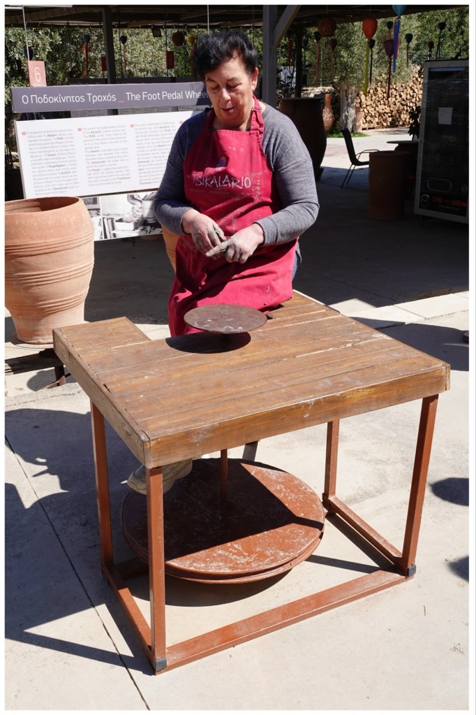 Once we’d seen Eleni’s modern tools, she showed us her old foot-pedal potter’s wheel for throwing small pots, and the two-person (a potter and a turner) versions used to make large jars.
