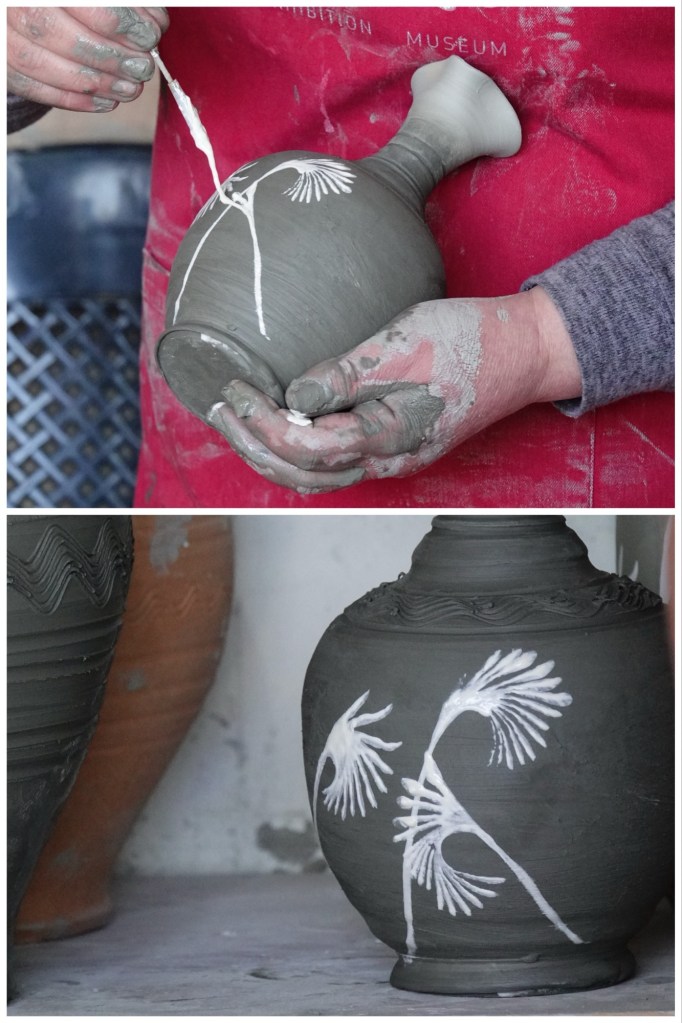 She also demonstrated creating the signature design that identifies the pottery as authentic to Margarites. The flowery pattern is painted on with white clay using a piece of untreated sheep’s wool.