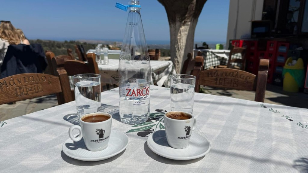 We stretched our legs a bit, peeking into the two tiny local churches before finding an outdoor café for cold water and hot thick Greek coffees.